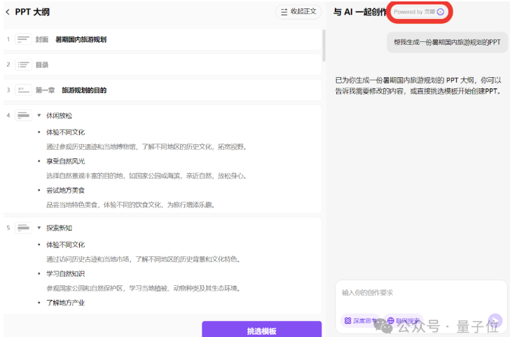 做 PPT 更是它的拿手好戏。别的 AI 工具还在用"主题+页数"的套路, WPS 灵犀已经进化到能和你"唠嗑式"制作 PPT 了。它先给你一个大纲,你觉得哪里不对劲就直接说,它会自动调整。
