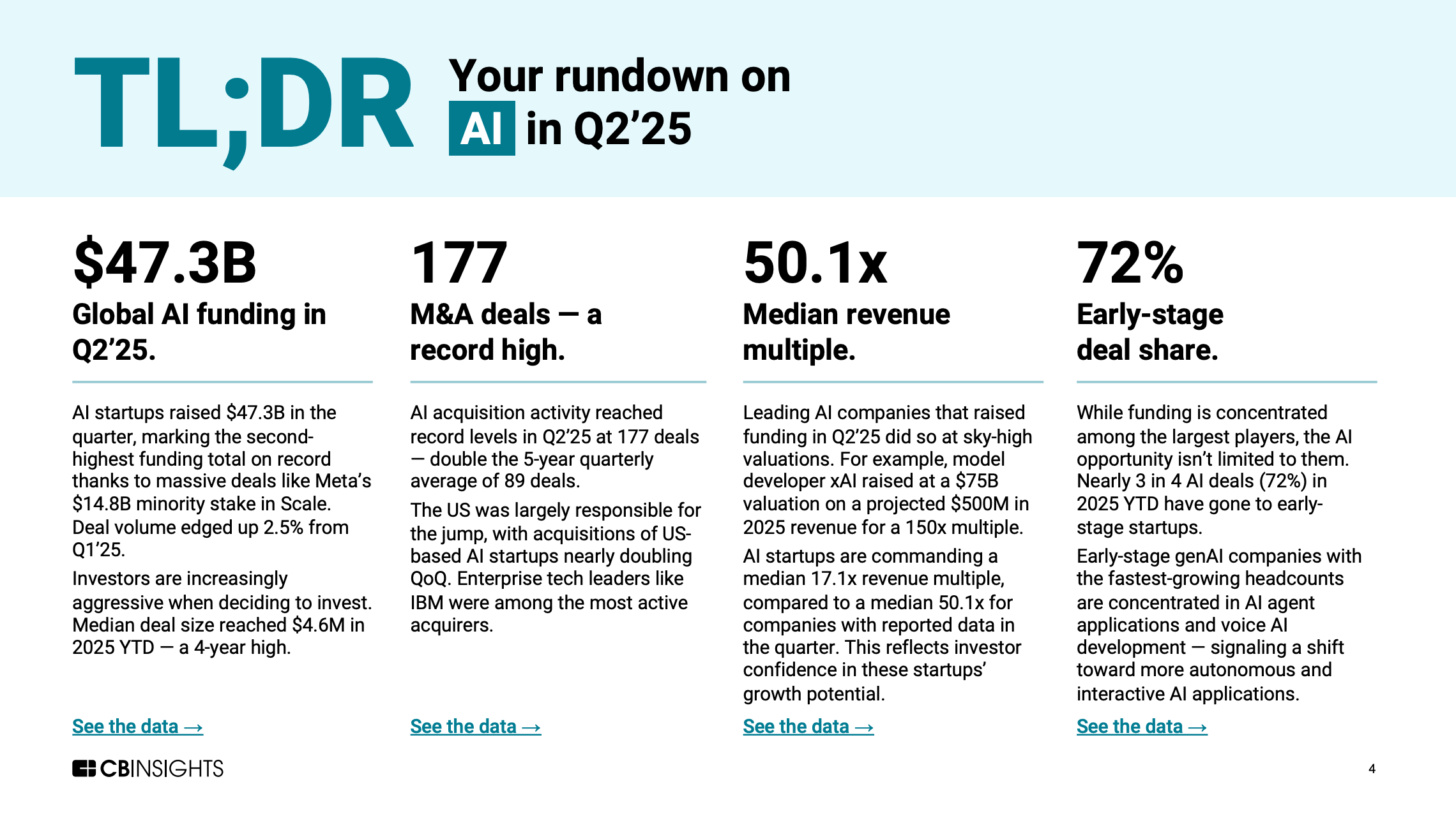 报告指出,2025 年第二季度全球 AI 初创企业融资总额达到 47.3 亿美元,创下历史纪录。这一数字反映了投资者对AI技术的持续信心和市场潜力。以下是投资趋势的关键亮点: