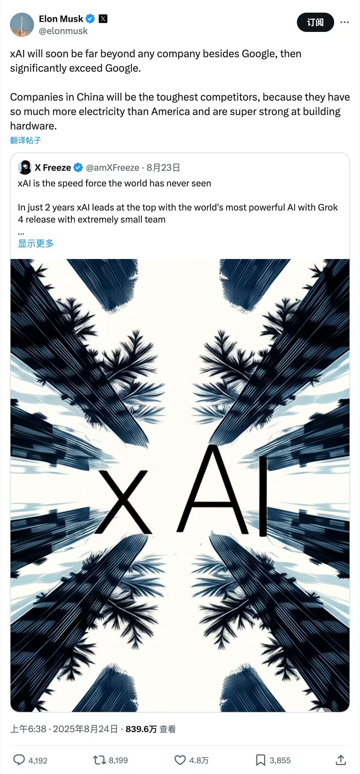 马斯克 24 日早间在 X 平台放出豪言,xAI 公司即将超越大多数竞争对手,仅次于 Google ,并最终大幅领先 Google 。