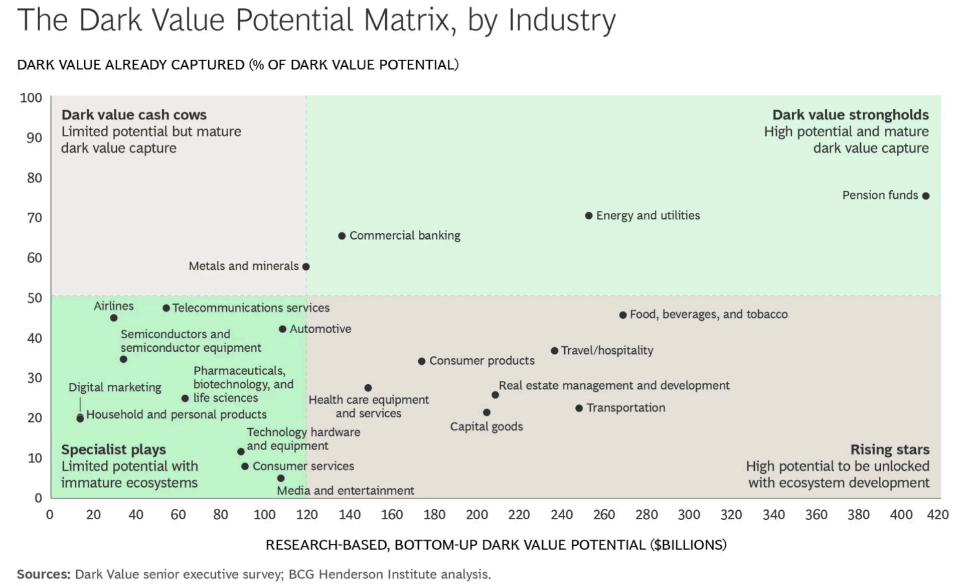 通过分析多个行业的影响, BCG 量化了这一价值:在某些行业,企业每年错失100亿至2800亿美元。整体而言,全球经济中的 暗价值 池子高达 3 万亿美元,相当于全球 国内生产总值 的2%至3%。这一估算基于 BCG 的定量模型和对500位C级高管的调研,后者认为 暗价
