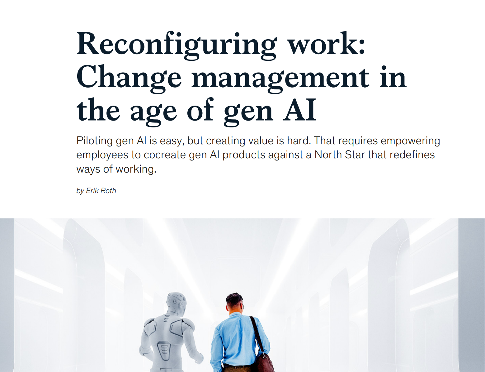 生成式AI( Gen AI )已经悄然进入职场,但它的真正价值却让人捉摸不透。虽然全球三分之二的公司都在使用 Gen AI ,但这些应用远不像过去的软件项目那样容易落地。麦肯锡公司近日发布的报告《重新配置工作:人工智能时代的变革管理》指出,CEO 们越来越意识到 Gen AI 的潜力,却不清楚如何从中创造实际价值。这份报告强调,试点 Gen AI 容易,但要释放价值,就需要员工共同参与,围绕一个清晰的“北极星”目标,重新定义工作方式。