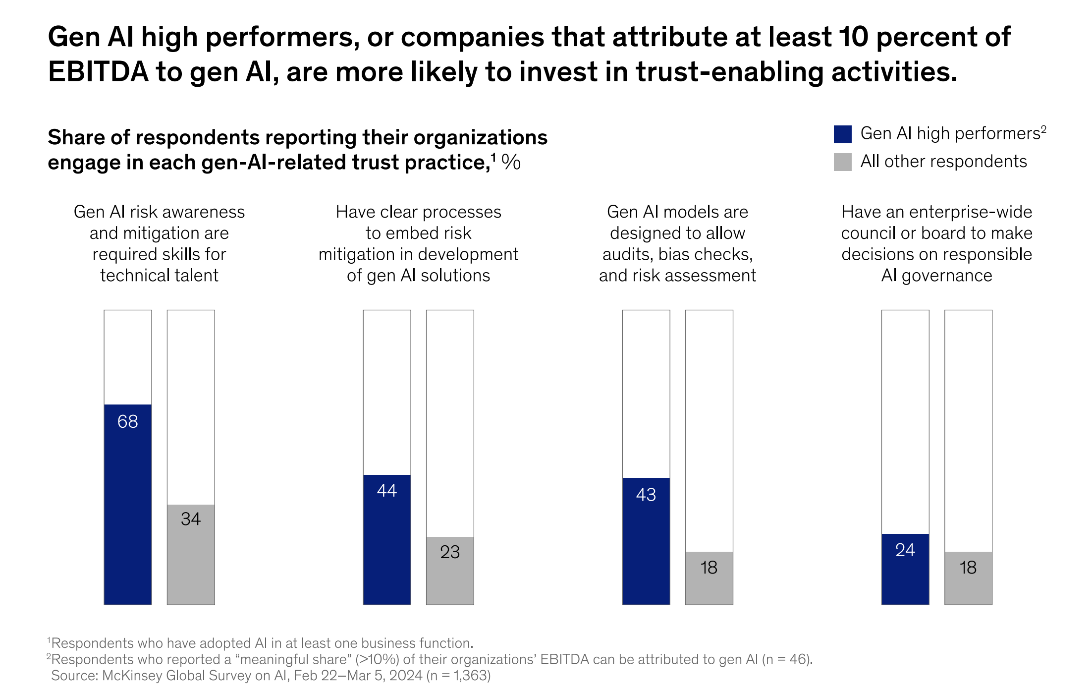 信任是 Gen AI 规模化的基础。如果员工不信输出,就不会信决策。报告指出,“ Gen AI 高绩效者”( Gen AI 贡献至少 10% EBITDA 的公司)更注重信任活动,比其他公司多投资此类举措(见Exhibit 1)。投资AI和数字信任的公司,收入增长 10%以上的概率几乎是两倍。