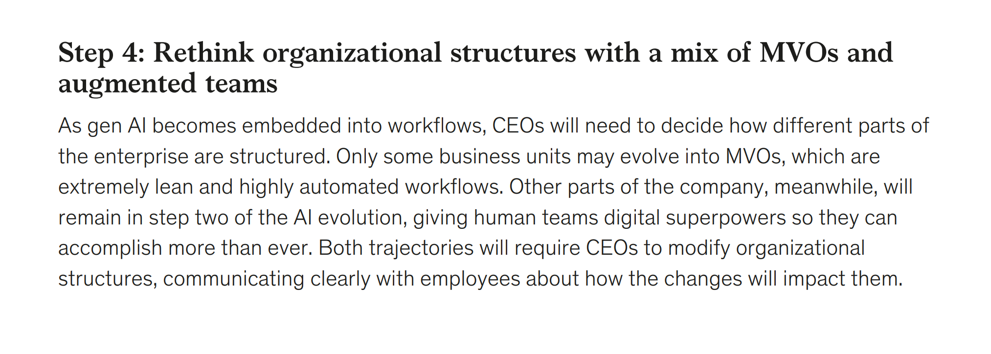 CEO 需决定哪些部分转为 MVO (精简、高度自动化),哪些保持增强团队(AI赋能人类)。 MVO 适合重复任务如发票处理,需投资AI运维和再技能化,如培训“AI工作流优化者”,前任务工人转岗。