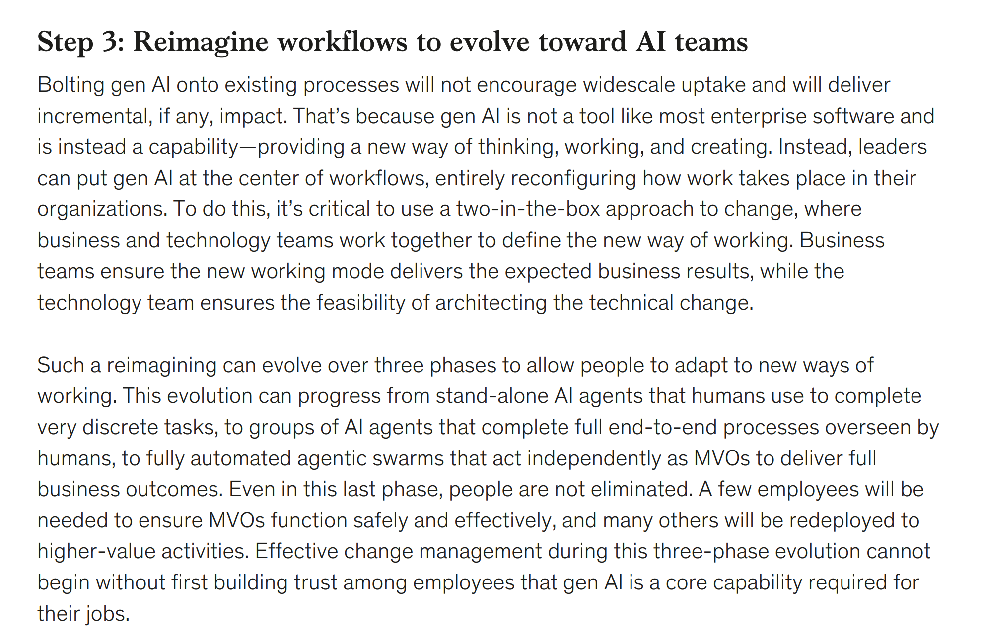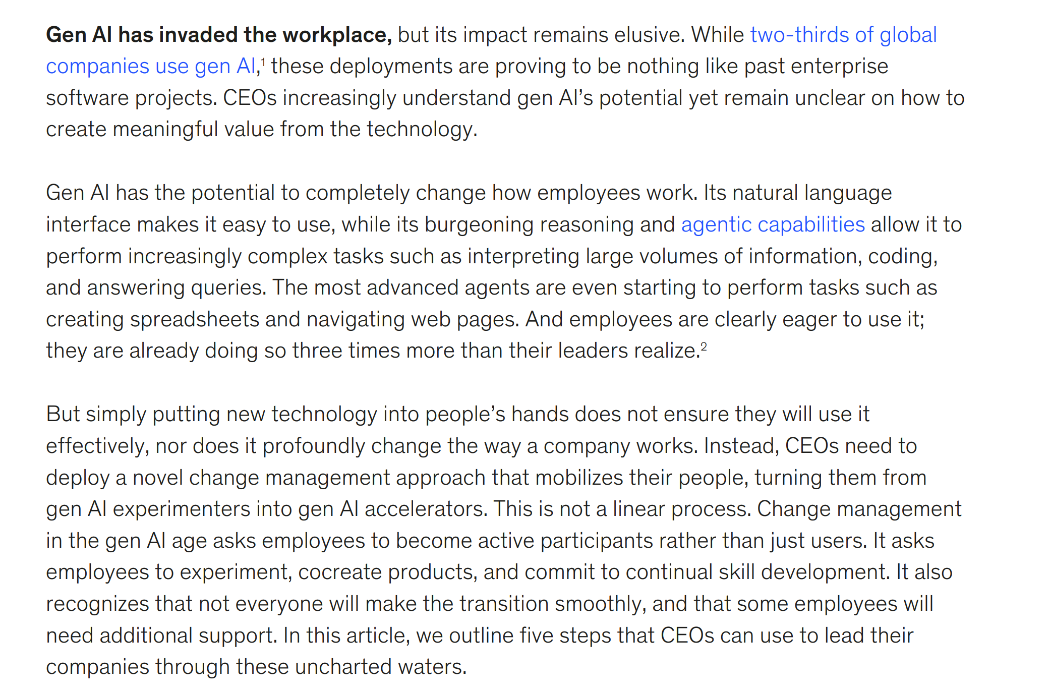 报告基于麦肯锡的最新研究,如《The State of AI》(2025年3月)和《Superagency in the Workplace》(2025年1月),揭示员工使用 Gen AI 的频率是领导者想象的三倍。它的自然语言界面让使用变得简单,而日益强大的推理和代理能力,能处理复杂任务如数据解读、编码和查询解答。甚至,一些高级代理已能创建表格或浏览网页。但光把技术塞到员工手里,不够——需要一种新型变革管理方法,让员工从实验者变成加速者。