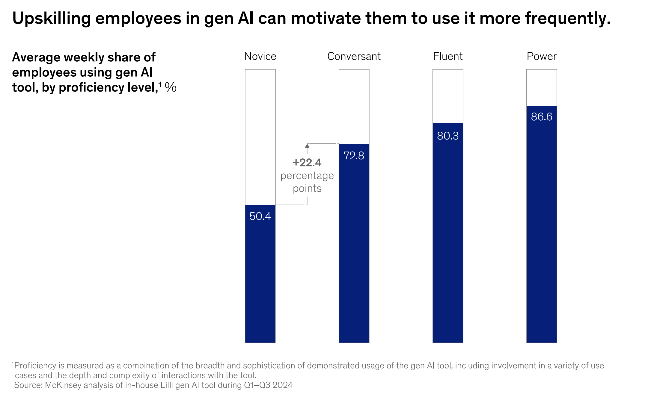 员工参与、正式培训和日常整合至关重要。麦肯锡的 Lilli 平台示例:92% 员工使用,74%定期使用,自 2023 年 7 月以来回答 1900 万提示,节省 30% 信息任务时间。这证明,重塑工作流能显著提升效率。