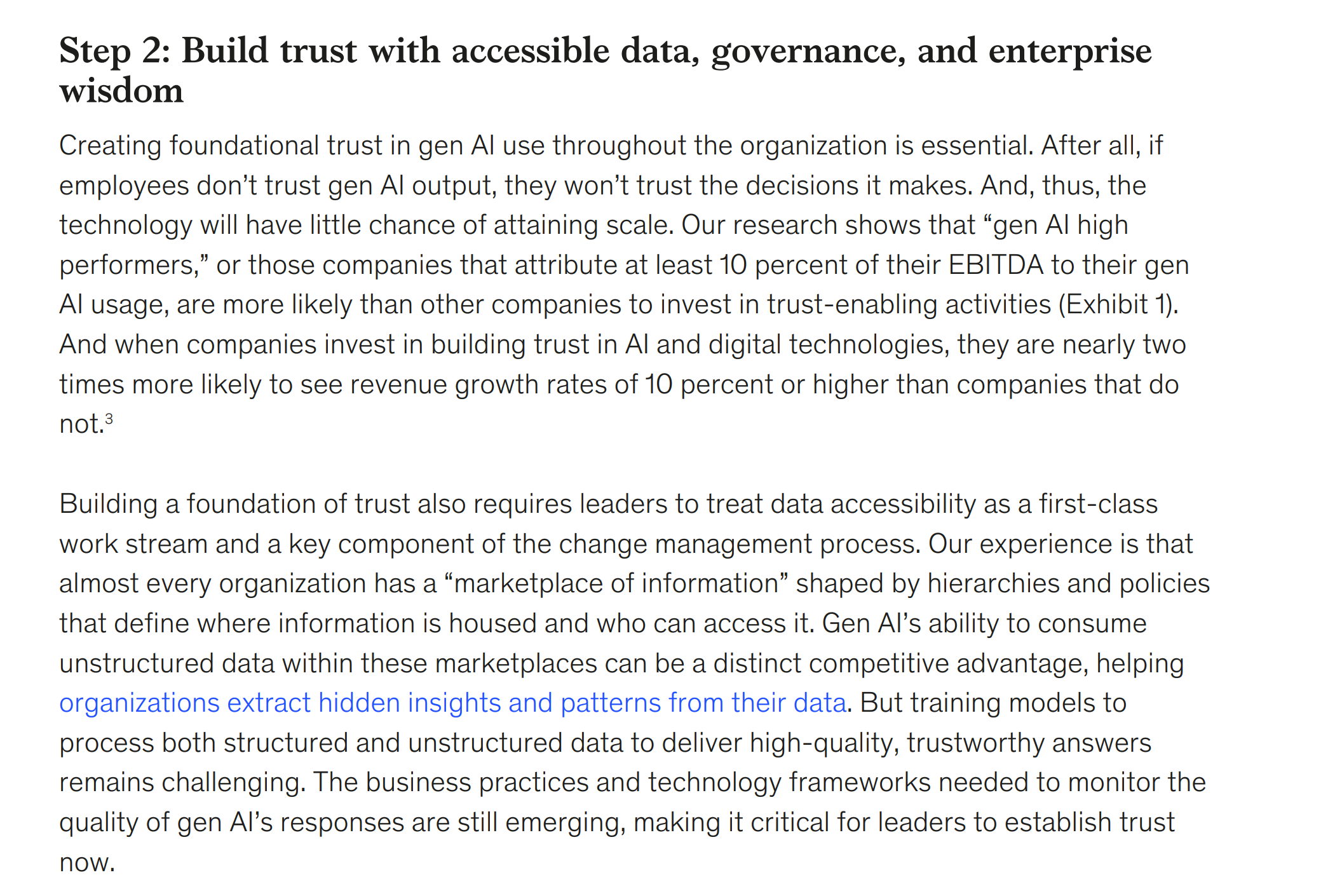 变革方法包括明确数据治理期望:CEO 与 CIO 和首席数据官合作,建立AI监督委员会、可接受使用政策、合规指南和“人类在回路”检查点。示例:摩根士丹利用 Gen AI 助手训练10万研究报告,经严格评估后采用率达98%,通过质量标准和护栏建立信任。