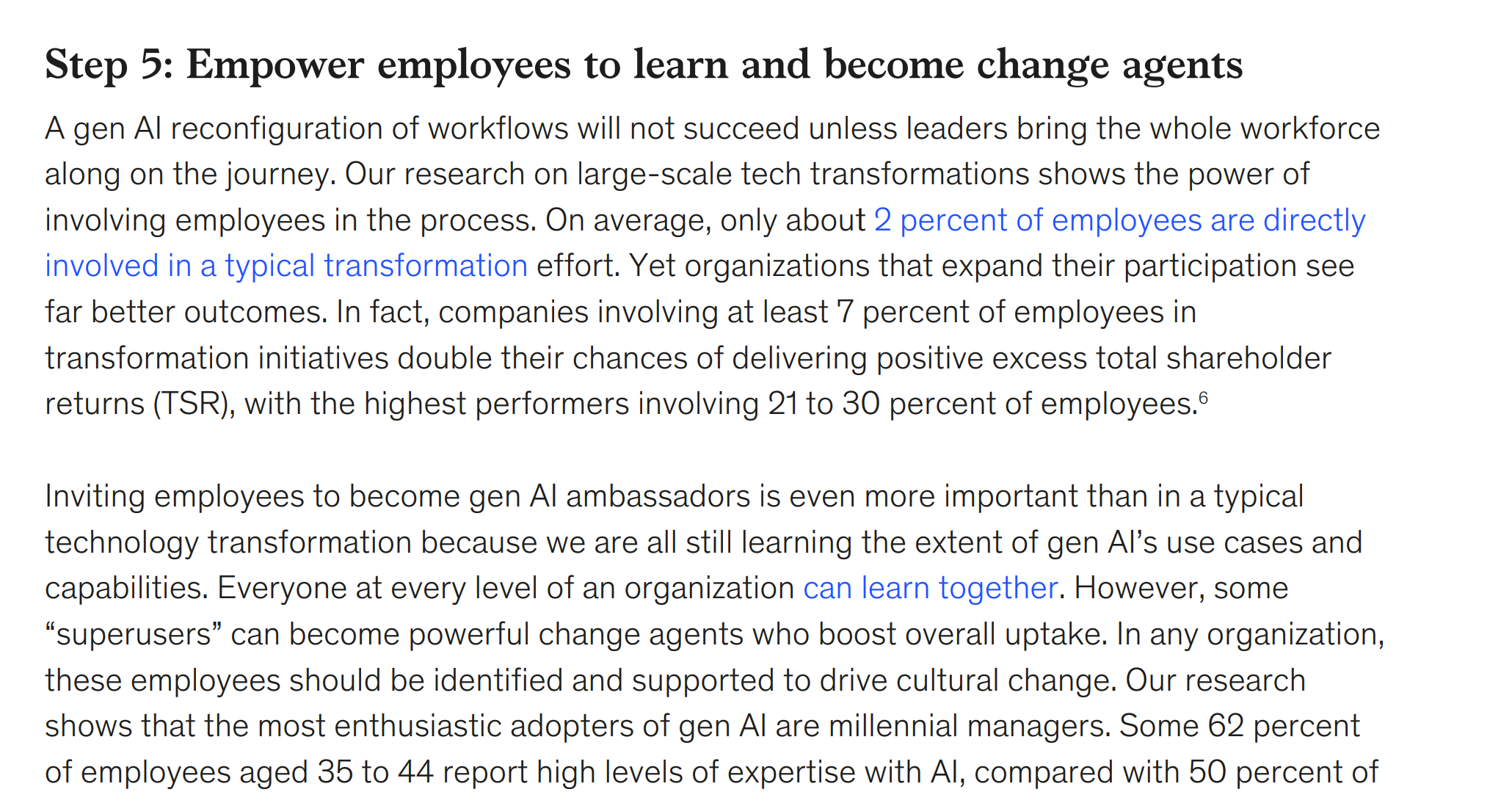 成功转型需员工主动参与。研究显示,涉及 7%以上员工的公司,转型成功率翻倍;顶级者涉及21-30%。识别 Gen AI 超级用户,尤其是 35-44 岁千禧一代经理(62% 高专长),让他们领导采用和导师他人。
