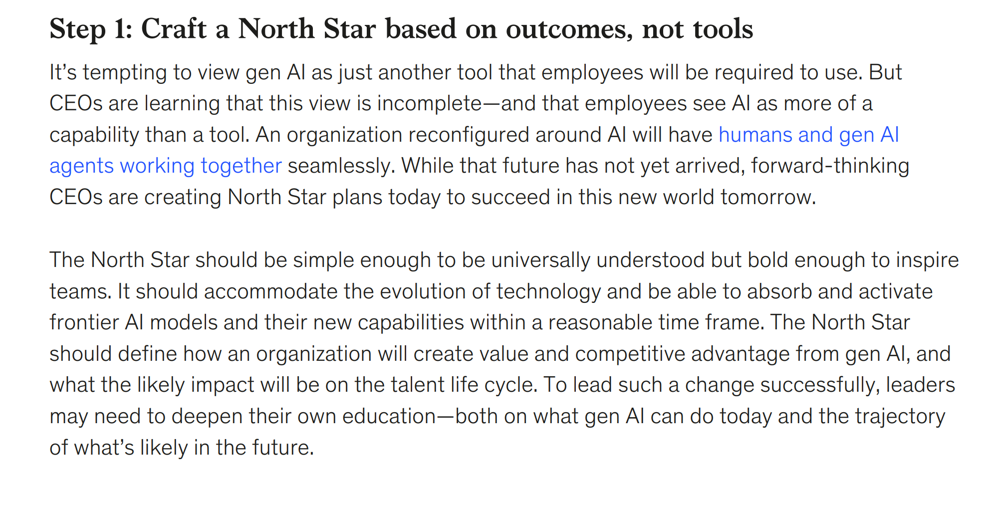 很多人容易把 Gen AI 视为又一个必须用的工具,但报告提醒,这是一种能力,而非单纯工具。展望未来,组织将由人类和 Gen AI 代理共同协作。CEO应现在就制定“北极星”计划:简单易懂、鼓舞人心,能适应技术演进,定义如何用 Gen AI 创造价值和竞争优势,并影响人才生命周期。