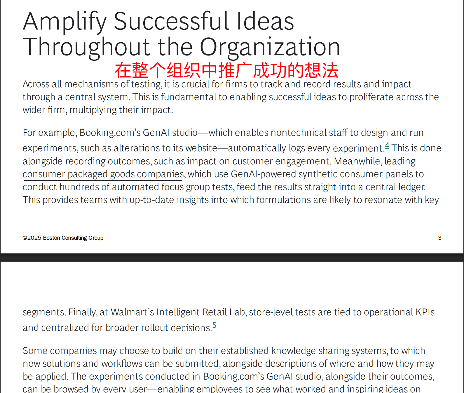 测试后,如何让好想法扩散?报告强调,建立中央系统追踪结果和影响。例如, Booking.com 的 Gen AI 工作室自动记录实验及结果,如客户参与度。消费品公司用 Gen AI 合成消费者面板,自动测试并存入中央台账。 Walmart 的智能零售实验室将门店测试与 KPI 绑定,便于全公司参考使用 。