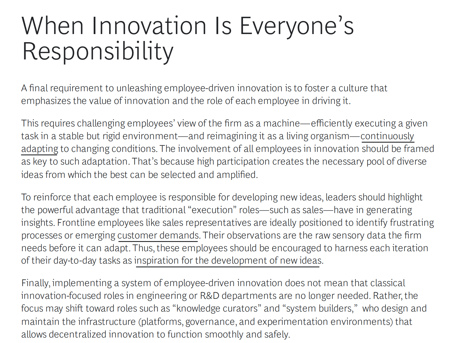 领导者应突出执行角色(如销售)的优势:他们一线观察到痛点和需求,这些是企业“感官数据”。鼓励员工从日常任务中汲取灵感。