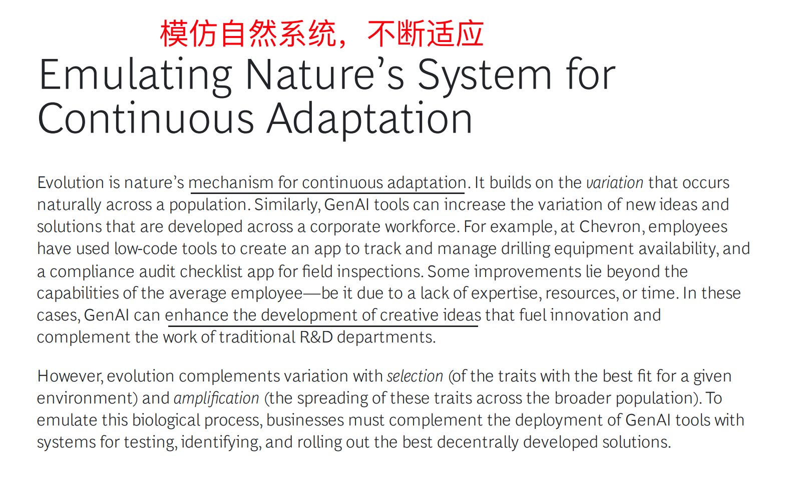 报告以自然进化作为比喻,解释企业如何构建持续适应机制。进化依赖于 变异(variation) 、 选择(selection) 和 放大(amplification) 。 Gen AI 工具如低代码平台,能大幅增加想法的变异,让非技术员工轻松开发解决方案。例如,在 Chevron ,员工用低代码工具创建了钻井设备跟踪 App 和现场检查合规清单 App 。这些工具还能激发创意,补充传统 R&D 部门的工作。