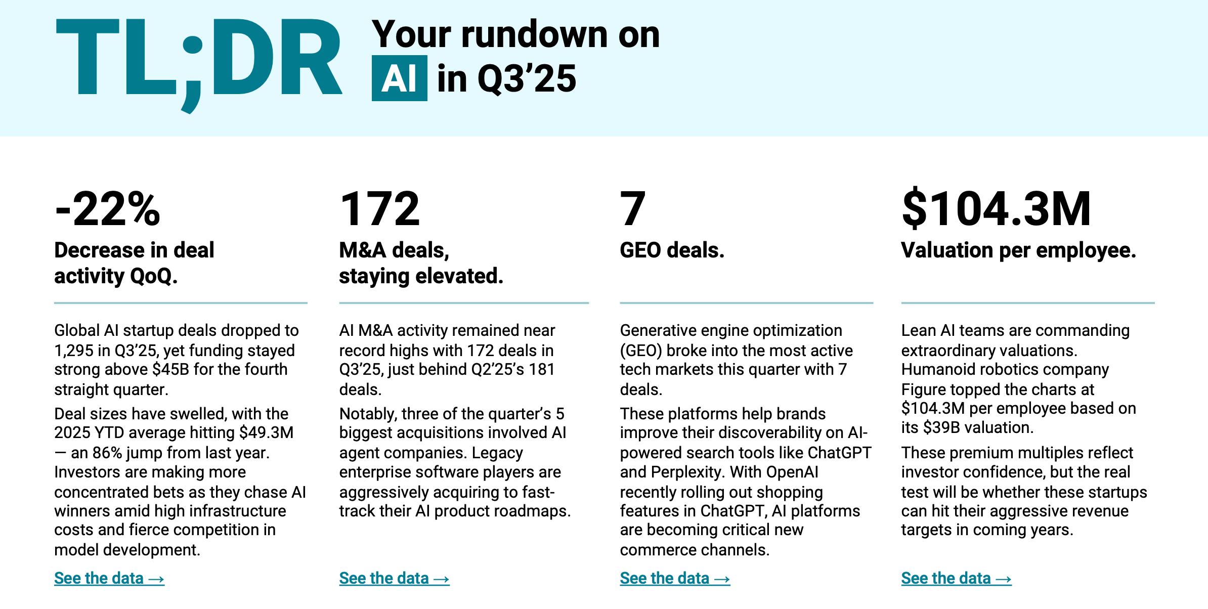 报告用一组醒目数字勾勒出 Q3AI市场的脉络:交易数环比下滑,但融资额稳超 450 亿美元,四季度连庄;M&A活动创历史新高,172 笔交易中代理 AI 公司独占鳌头;新兴的Generative Engine Optimization (GEO)领域冒头,7笔交易预示AI搜索成新商务战场;人形机器人Figure以每员工 $104.3M 估值领跑,凸显精简团队的“黄金倍数”。