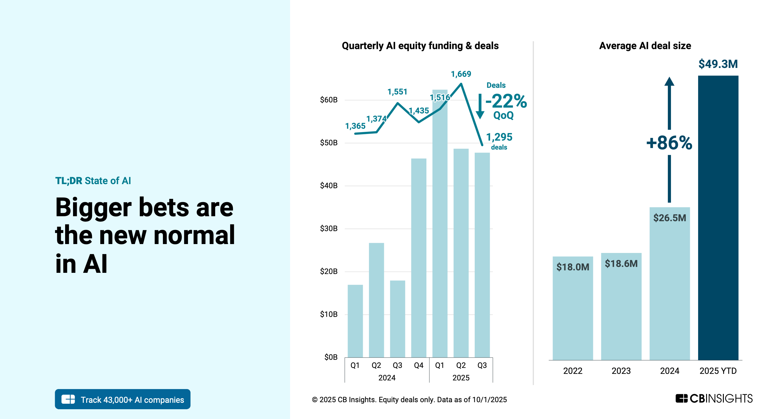 2025 第三季度,AI初创融资像过山车:全球交易数 1,295笔,环比下滑 22%,但总金额仍超 450 亿美元,已是连续第四季度高位。为什么交易数掉队?报告指出,高