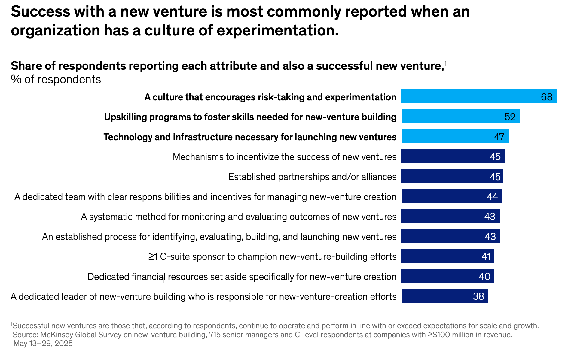 报告强调,新风险成败不止看 idea,更靠人和技术。基础要素如C级赞助、专用资金已成标配;如今,区分胜负的是文化与技能。鼓励风险与实验的文化下,68% 的风险“超预期”——员工敢试错、无畏失败,创新自然涌现。