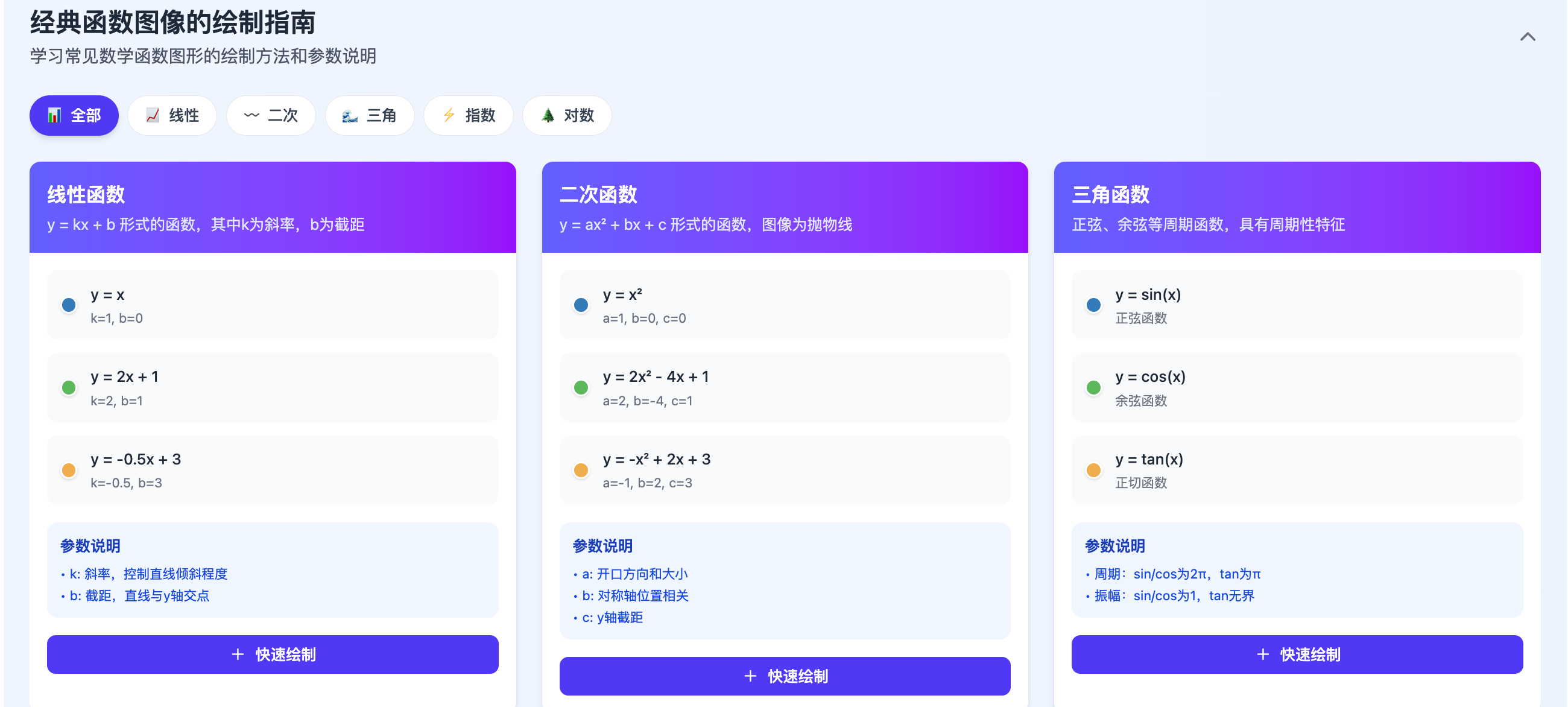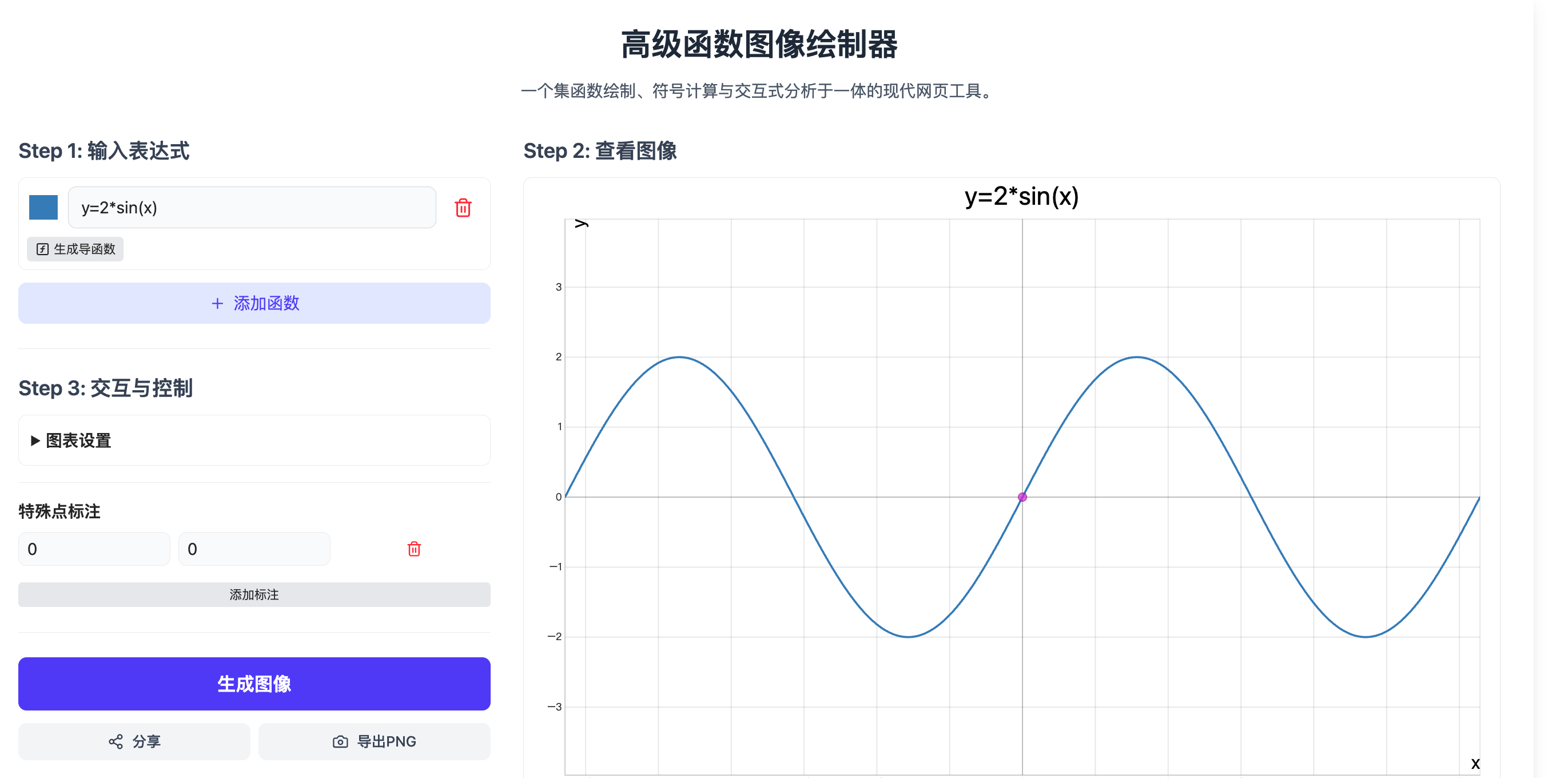 老师用起来更方便。备课时,不用黑板涂鸦,直接在工具上生成示例图,投影到课堂。让学生集体改参数,比如把 y=sin(x) 的振幅从 1 调到 2,看波浪怎么“涨潮”。互动性强,课堂不枯燥。反馈里有个老师说,用它做了个小测验:给学生一个函数,让他们预测图像变化,然后现场验证。全班都参与,学习效果翻倍。