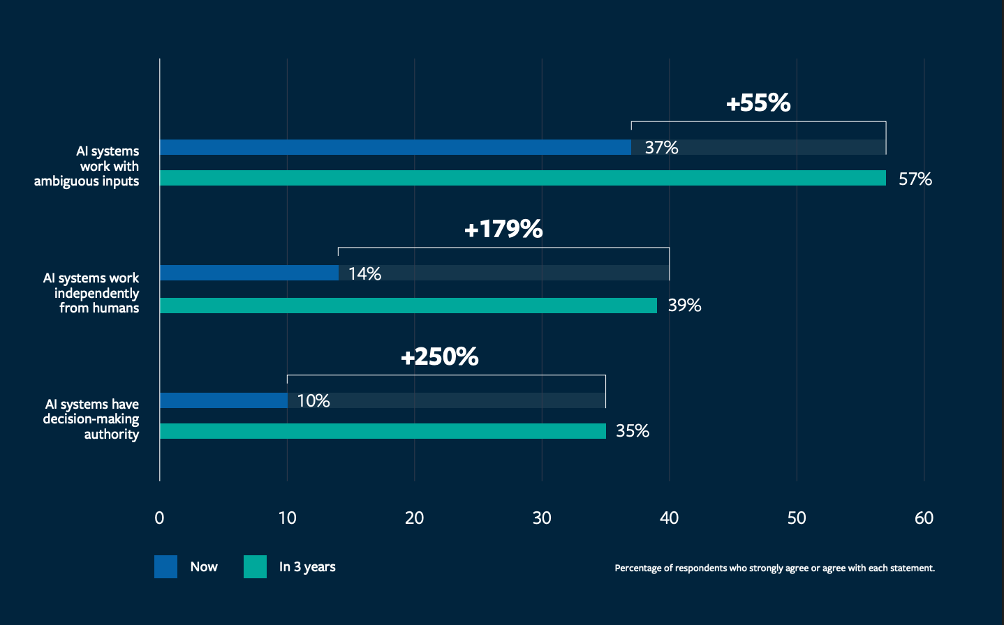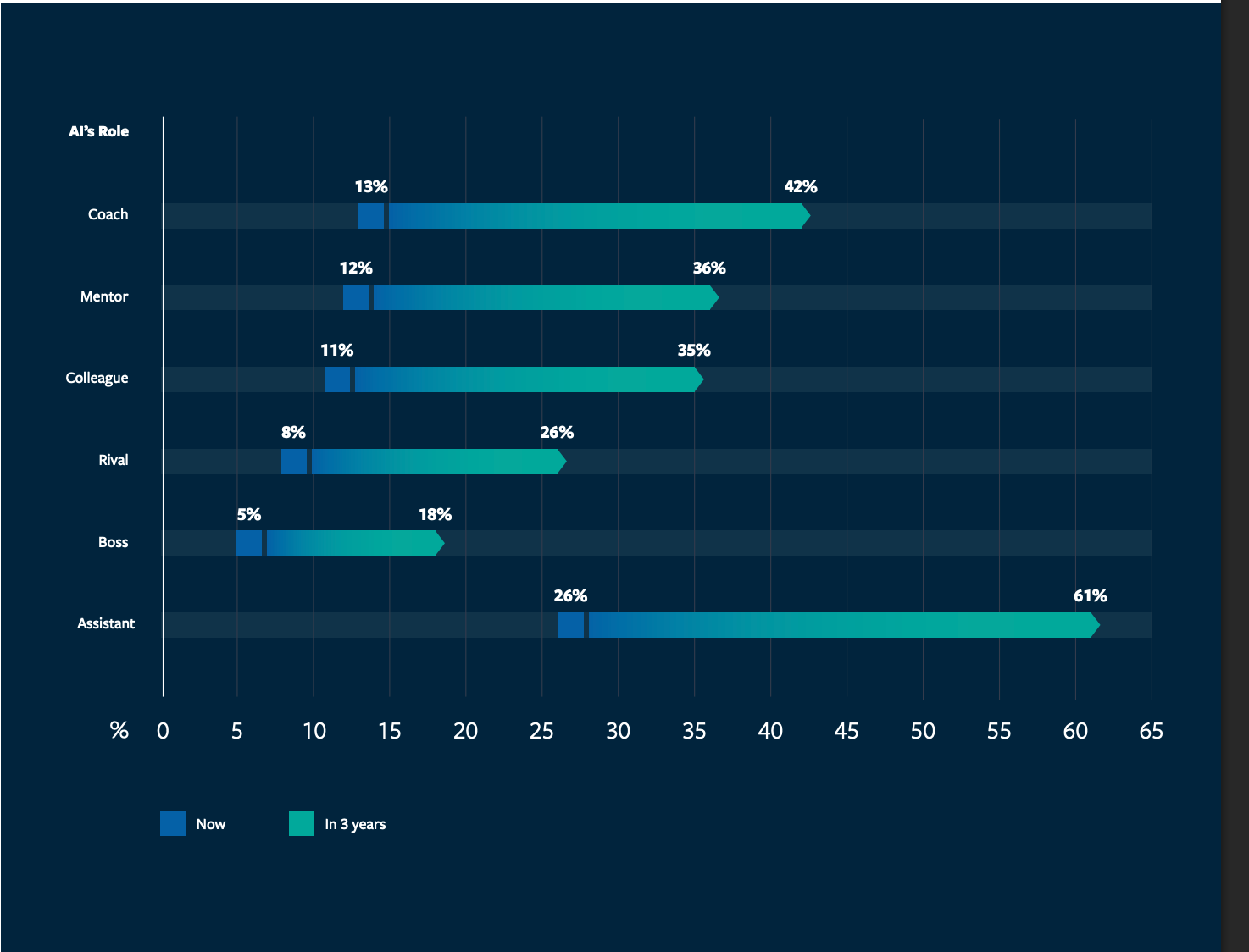 调研还显示,高管预计三年内,AI角色将从 26% 的“助手”跃升至 61%,“教练/导师/同事”占比超 35%,而“对手/老板”仅 18% 和 26%。这预示agentic AI将成团队一员,推动流程重构。