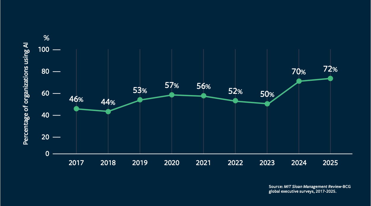 传统 AI 采用率从 2017 年的 46% 稳步升至 2025 年的 72%;生成式AI仅用三年就达70%;而agentic AI短短两年,已有**35%**企业部署,另 44% 计划跟进。