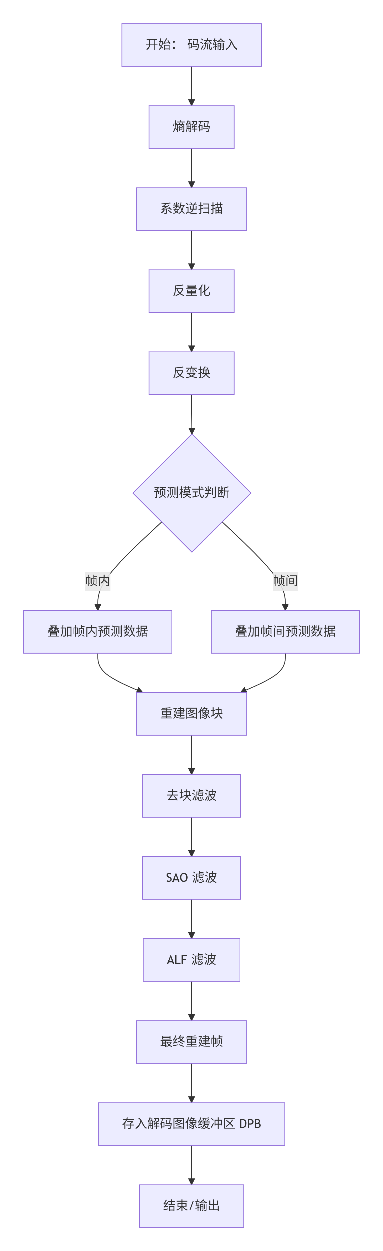 svac2解码首先要进行熵解码,将所有相关参数解码出来,将系数进行逆扫描,反量化,反变换,再与帧间预测或帧内预测的数据进行叠加,然后进行去块滤波,SAO,ALF,再将解码出来的帧放进解码缓冲区。具体流程如下图: