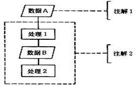 图2 7.连接符---- 圆表示连接符,用以表明转向流程图的它处,或从流程图它处转入.它是流线的断点.在图内注明某一标识符,表明该流线将在具有相同标识符的另一连接符处继续下去(参看以下关于连接符使用的约定). 8.端点符---- 扁圆形表示转向外部环境或从外部环境转入的端点符.例如,程序流程的起始或结束,数据的外部使用起点或终点. 9.注解符---- 注解符由纵边线和虚线构成,用以标识注解的内容.虚线须连接到被注解的符号或符号组合上.注解的正文应靠近纵边线.请参看图3给出的注解符使用示例.