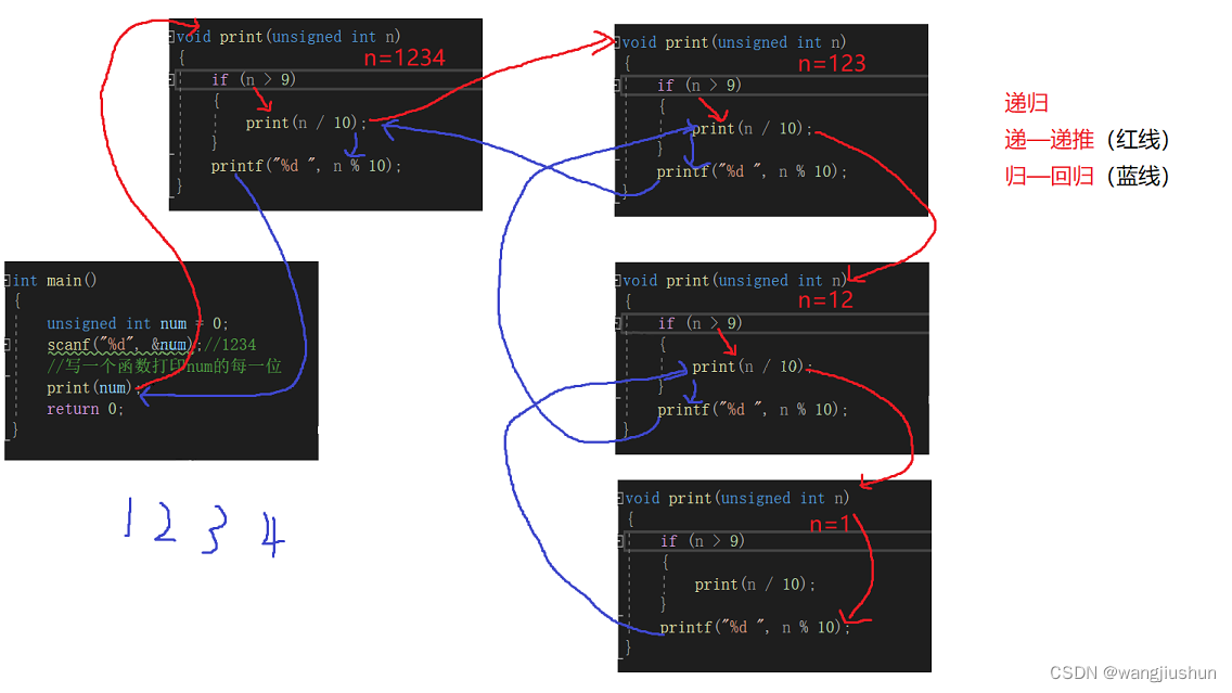 递归要分开:递 --递推,归 --回归。先递推后回归