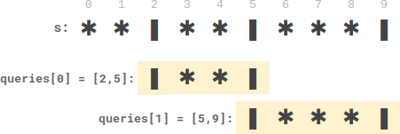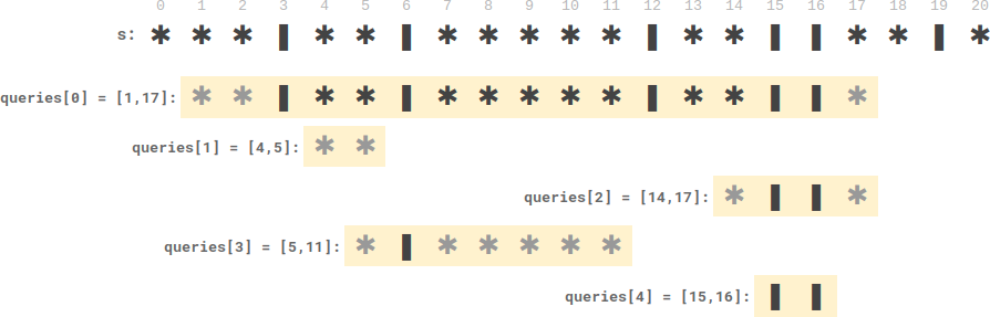 Input: s = “*||*||||*”, queries = [[1,17],[4,5],[14,17],[5,11],[15,16]]