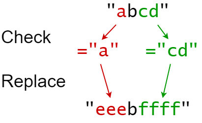 Input: s = “abcd”, indices = [0, 2], sources = [“a”, “cd”], targets = [“eee”, “ffff”]