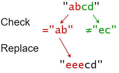 “ab” occurs at index 0 in s, so we replace it with “eee”.