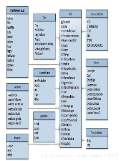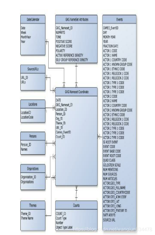 传统上,维模型是一种包含许多事实和维表的数据库表结构。由于它们在实体关系图中的出现,它们通常被称为具有星型或雪花型方案。在这样的模型中,事实是可以被计数或求和的值,并且通常在给定的时间点提供度量。由于它们通常基于交易或重复事件,因此事实的数量倾向于变得非常大。另一方面,维度是信息的逻辑分组,其目的是限定事实或将事实上下文化。它们通常为通过分组或汇总来解释事实提供一个切入点。同样,维度可以是分层的,一个维度可以引用另一个维度。我们可以在图2中看到扩展的GKG尺寸结构图。