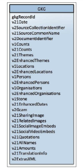 有一些重要的原则需要理解,无论从计算还是在人工方面,从长远来看肯定可以节省时间。 像许多CSV一样,此文件隐藏了一些复杂性,如果在此阶段无法很好地理解,则可能在稍后的大规模分析中成为一个真正的问题。 GDELT文档描述了数据。 可以在这里找到:http://data.gdeltproject.org/documentation/GDELT-Global_Knowledge_Graph_Codebook-V2.1.pdf。 它表示每条CSV行都是换行符分隔符,其结构如图1所示: