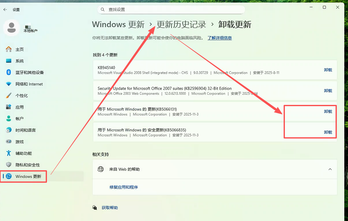 - 打开“设置” > “Windows更新” > “更新历史记录” > “卸载更新”。