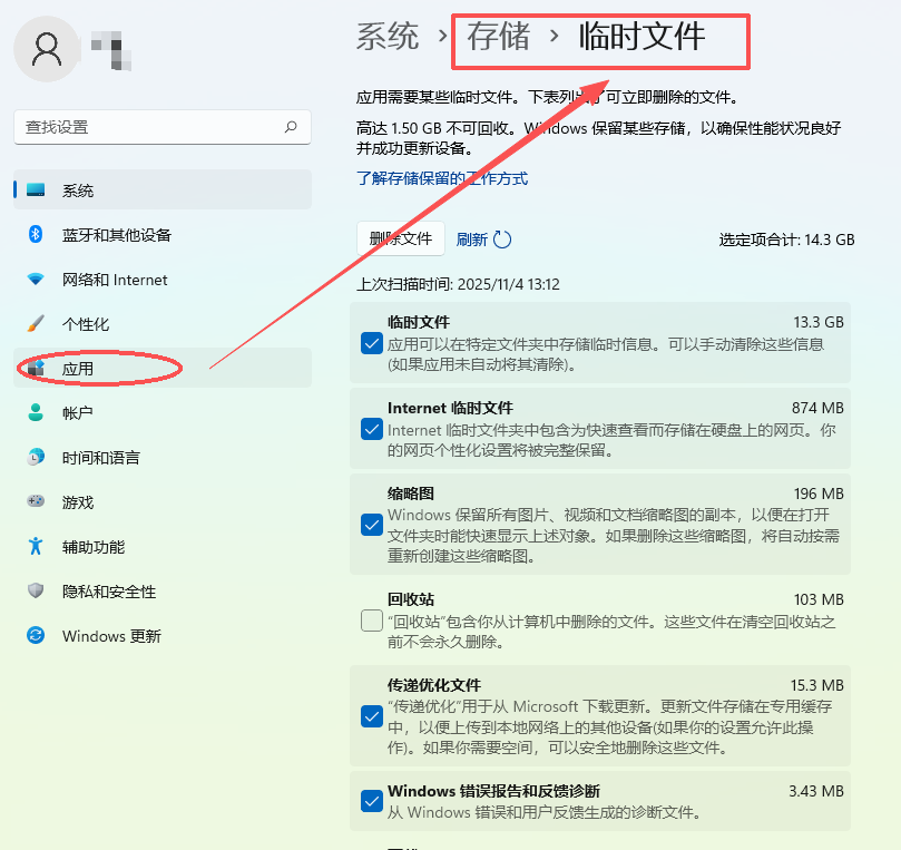 - 打开“设置” > “系统” > “存储” > “临时文件”。