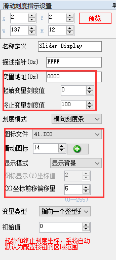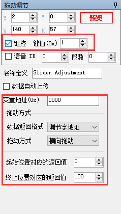 滑动刻度指示和拖动调节是相互配合使用的,由于本液晶屏没有触摸屏,这里我们设置拖动调节为键控的方式,并设置键值为1。其本质就是向4F寄存器里面写入数值,以命令的方式代替触控的过程设置参数如图14所示。