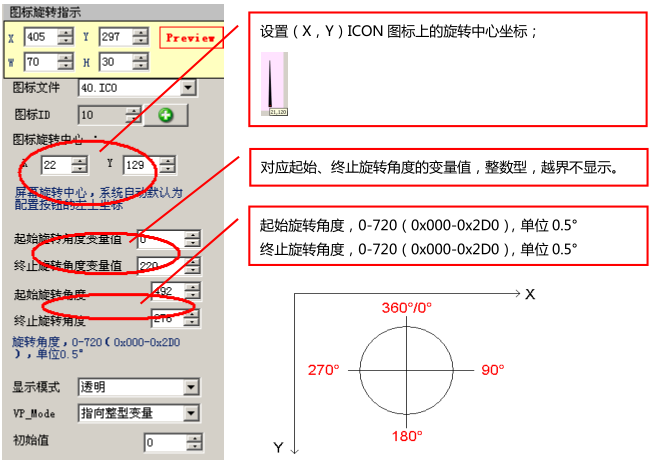 本指令主要用于仪表刻度盘的指针指示。旋转始终假定为“顺时针”转动,即终止旋转角度必须大于起始旋转角度。使用时要先在图标变量里面设置好选用的指示指针,并且要在液晶的显示页面添加合适的表盘,其参数设置如图二十所示: