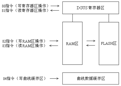 DGUS液晶屏共有5条通信指令。如图3所示,这5条指令被分为3组,一组(0x80、0x81)用于对DGUS寄存器区的访问,一组(0x82、0x83)用于对用户RAM区的访问,一组(0x84)用于刷新曲线。如图三所示: