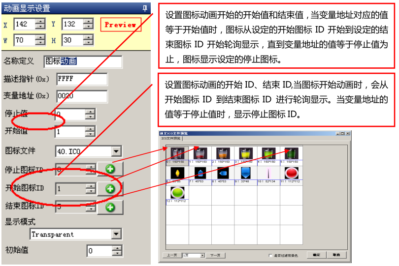 显示动画图标,设定开始值和停止值,当数据等于开始值时,DGUS 开始重开始图标到结束图标循环播放,每副图标的显示时间自动分配,动画图标参数设置及说明如图十二所失。