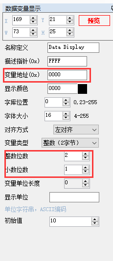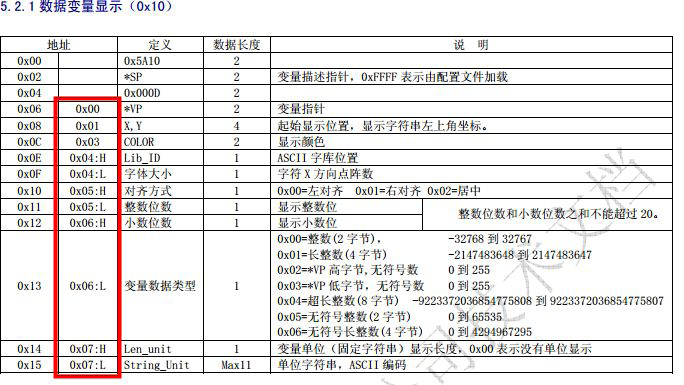 (5)数据变量 不同的数据类型占用的地址大小不同,最少占两个字节地址,如设置整数,发送5A A5 05 82 000A 000B,在0x000A地址里写入11,如长整数:5A A5 07 82 000B 0000 000B 在000B和000C地址里面写入数11,数据变量显示的单位占用的是描述指针地址,最多可显示11个ASCII码。