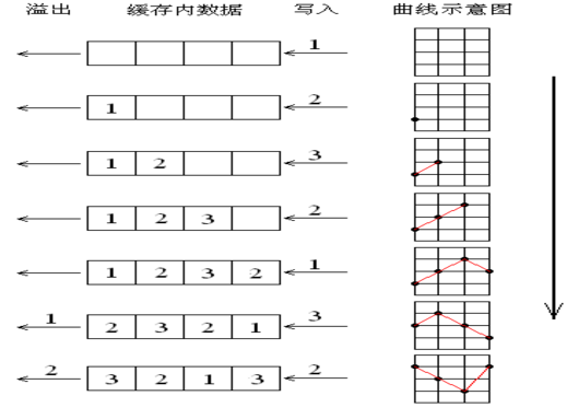 DGUS液晶屏内部设有专门的类似FIFO性质的曲线数据缓存区,可同时满足8条曲线的数据缓存。用户对此空间只能写,不能读。横轴间隔设置好以后类似于横轴的坐标轴已经设置好,缓冲区的数据作为纵坐标。曲线形成示意图如图十九所示: