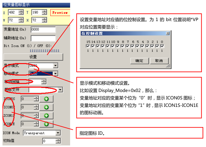 用于通过变量分解成的位变量来进行控制的功能。一个变量可分成 16 位,逆序排列,图标需从预先生成的 ICO 图标库调用,位变量参数设置如图十七所示: