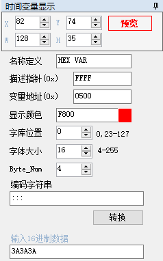 (8)HEX变量(时间变量) 占用变量地址根据右边设置 Byte_Mum的长度来的,比如Byte_Mum设置4,那么地址占用是4个字节,也就是2个变量地址,编码字符串占用描述指针的地址。