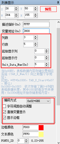 (2) SP指某个VP地址显示的控件的属性地址,以便在应用中可以让用户指令修改,达到实时控制不同显示效果目的如字体颜色、位置、状态等属性。可以不定义(默认FFFF)。如图1所示,红色的框里面的内容即为描述指针(属性地址),黄色的框里面的内容为变量地址(实际地址)。