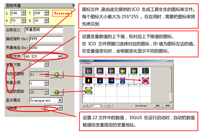 图标随变量值的变化而变化,可设定变量上下限。图标需从预先生成的 ICO 图标库调用,设置参数及说明如图十一所示。
