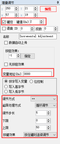 数据变量显示和增量调节的配置使用方法和上面的一组是类似的,这里设置键控值为2。需要注意的是:由于数据变量显示设置了一位的小数,而增量调节设置的步长是5,所以每次发送命令之后,数据的值以0.5的大小在变化,如果没有设置小数位则数值以5的大小在变化。