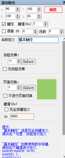 和前面的类似我们设置这些触控的控件为键控的方式,由于其属性为基本触控,所以可用在任何需要触控功能的地方,以实现按钮效果,或是页面切换效果。