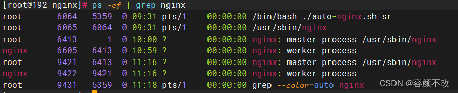 1)查看进程号:其中master是主进程,或者直接查看上边配置的nginx.pid