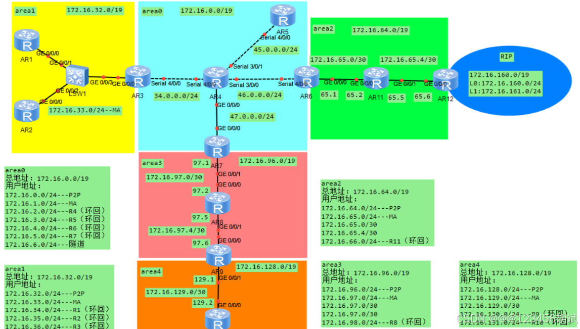 3、整个OSPF环境IP基于172.16.0.0/16划分;除了R12有两个环回,其他路由器均有一个环回IP