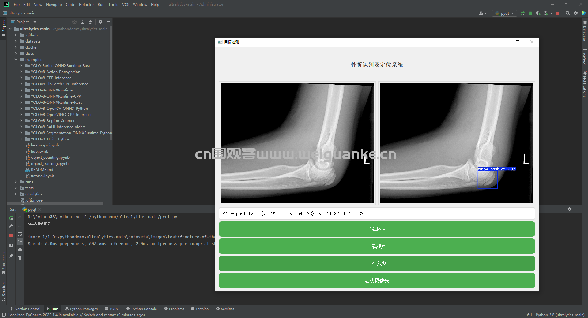 支持加载预训练的YOLOv8模型。能够进行实时预测,快速识别和定位骨折。