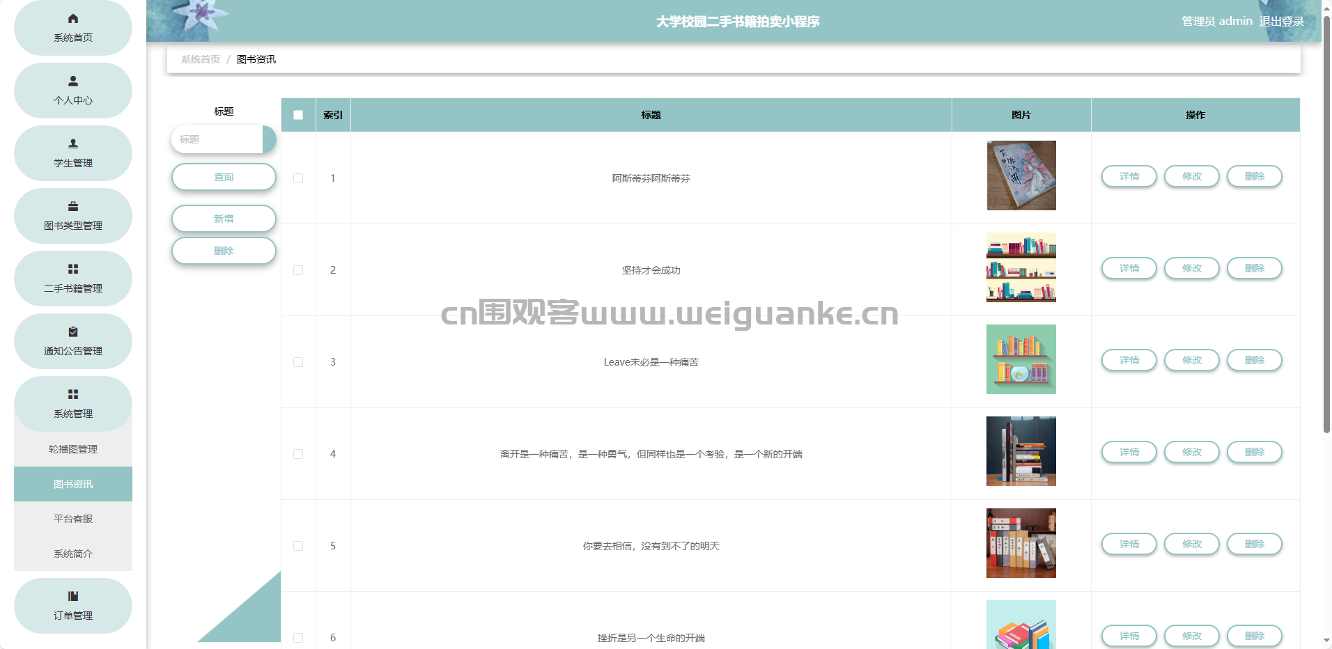 图书资讯:管理员可以管理图书资讯信息,包括查询、新增、修改和删除图书资讯。