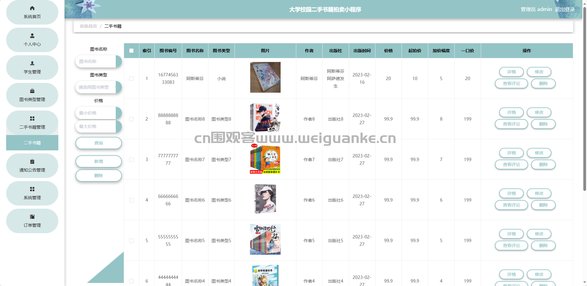 管理员可以管理二手书籍信息,包括查询、新增、修改和删除书籍。二手书籍管理界面如图所示,管理员可以进行相关操作。