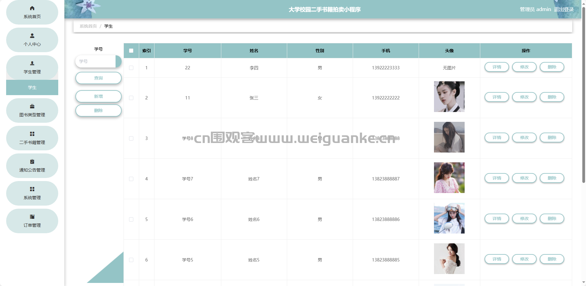 管理员可以管理学生信息,包括查询、新增、修改和删除学生信息。学生管理界面如图所示,管理员可以进行相关操作。