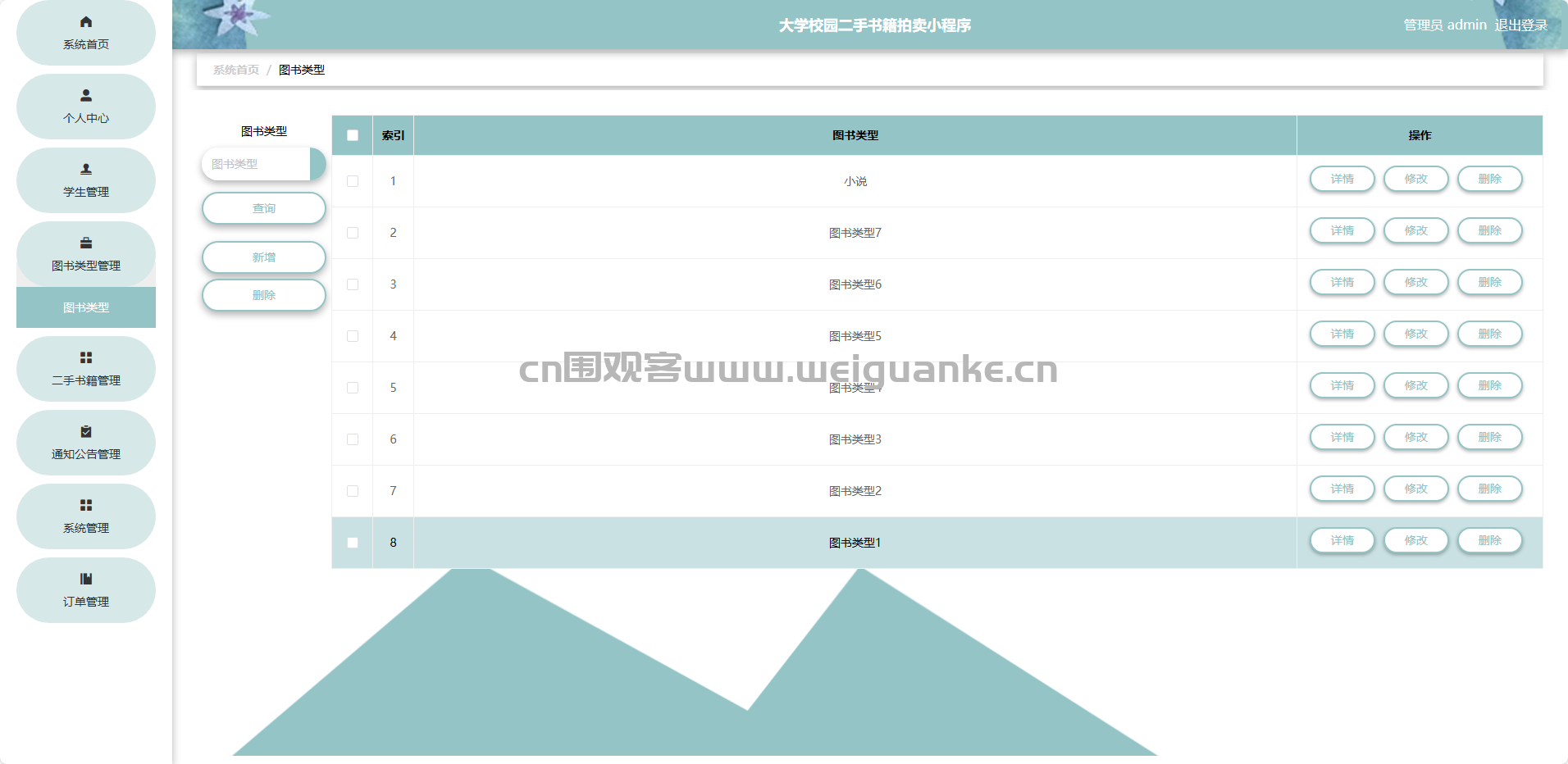 管理员可以管理图书类型信息,包括查询、新增、修改和删除图书类型。图书类型管理界面如图所示,管理员可以进行相关操作。